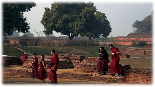 미니어처 사리탑 근처에 서서 진홍색 옷을 입은 작은 무리의 젊은 승려들이 이전 사원의 큰 받침대 꼭대기에 모이기 위해 멈추기 전에 사이트를 둘러보는 것을 보았습니다. 젊은 고행자들은 명상적인 휴식을 취하며 똑바로 앉아 영광스러운 과거에 대한 조용한 경의를 표하는 Great Monument에 눈을 고정했습니다. (참고 - 수가토 무케르지)